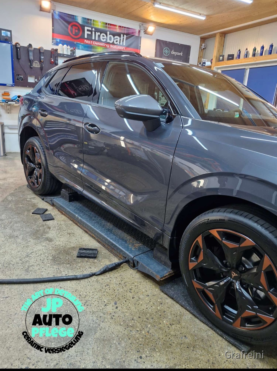 Jetzt ist er außen und innen geschützt. Lack und Felgen wurden mit einer keramischen Beschichtung versiegelt. Außerdem wurden alle Scheiben und Außenspiegel versiegelt. Innen wurden die Kunststoffteile gepflegt und alles was aus Leder oder Kunstleder ist wie die Seitenwänden der Sitze oder Mittelarmlehne wurden ebenfalls versiegelt. Jetzt steht er da wie von mir gewünscht ![]()