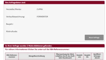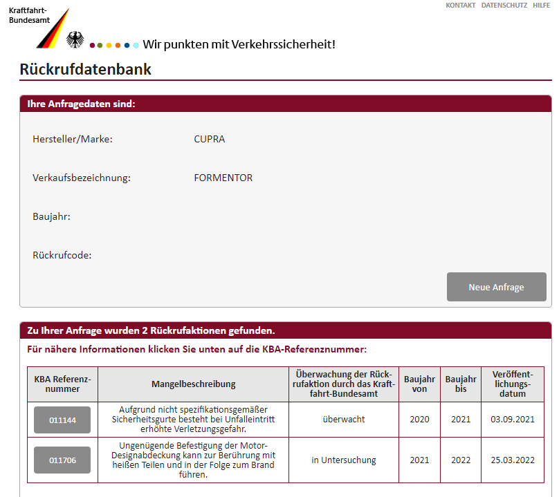 Und in der KBA Datenbank gibt es für Formentor lediglich 2 Rückrufe.