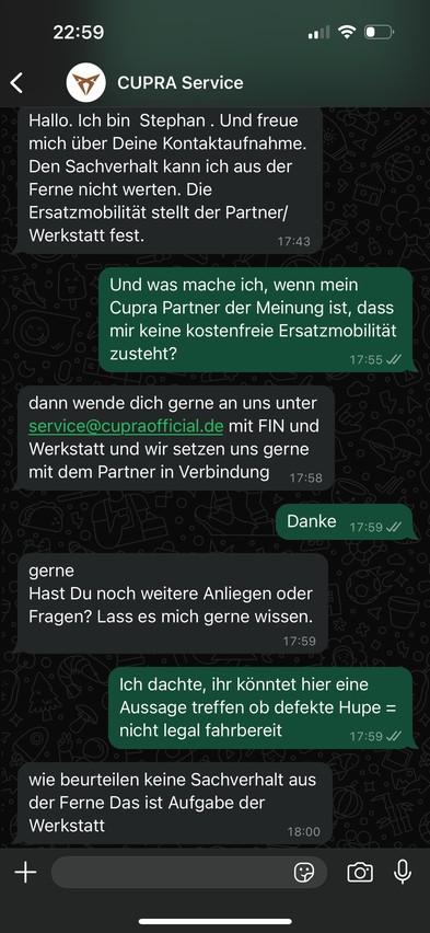 Machen die sich ernsthaft nun wegen 2,5h Ersatzwagen in die Hose? Nicht mehr normal. Sollen dir ohne Cupra Care einfach einen Vorführer mtgeben und gut ist.