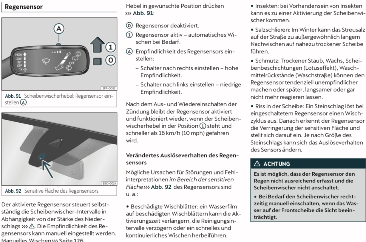 Habe ich heut weich festlellen müssen die Integralstellung bzw Regensensor funktionieren überhaupt nicht zuverlässig, unglaublich frustrierend. Hebel auf Stellung 1 und Stufe 4 Empfindlichkeit einfach viel zu träges und zu lange dauerndes wischen. Gibt es da Abhilfe, kann man was codieren? Gefühlt funktioniert der Regensensor nicht, falls Fragen diesbezüglich kommen, Scheibe war sauber und gereinigt.