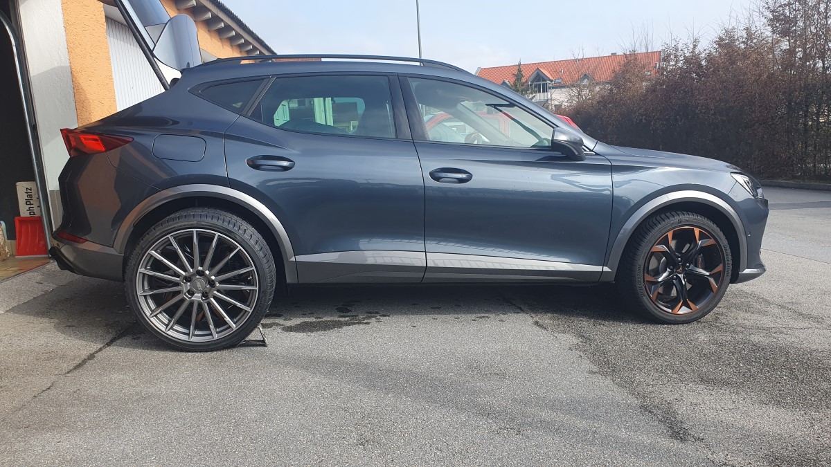 Korrekt, AEZ Atlanta titan, graphite matt frontpoliert 8,5x20 ET 38 mit 245 35 R20 (Eintragungsfrei). Nabenzentrierung wie die Originalfelge 57,1, dadurch entfällt ein Zentrierring, Befestigung mit den originalen Radbolzen und für 25€ gibt es Nabenkappenadapter für die originalen Kappen.