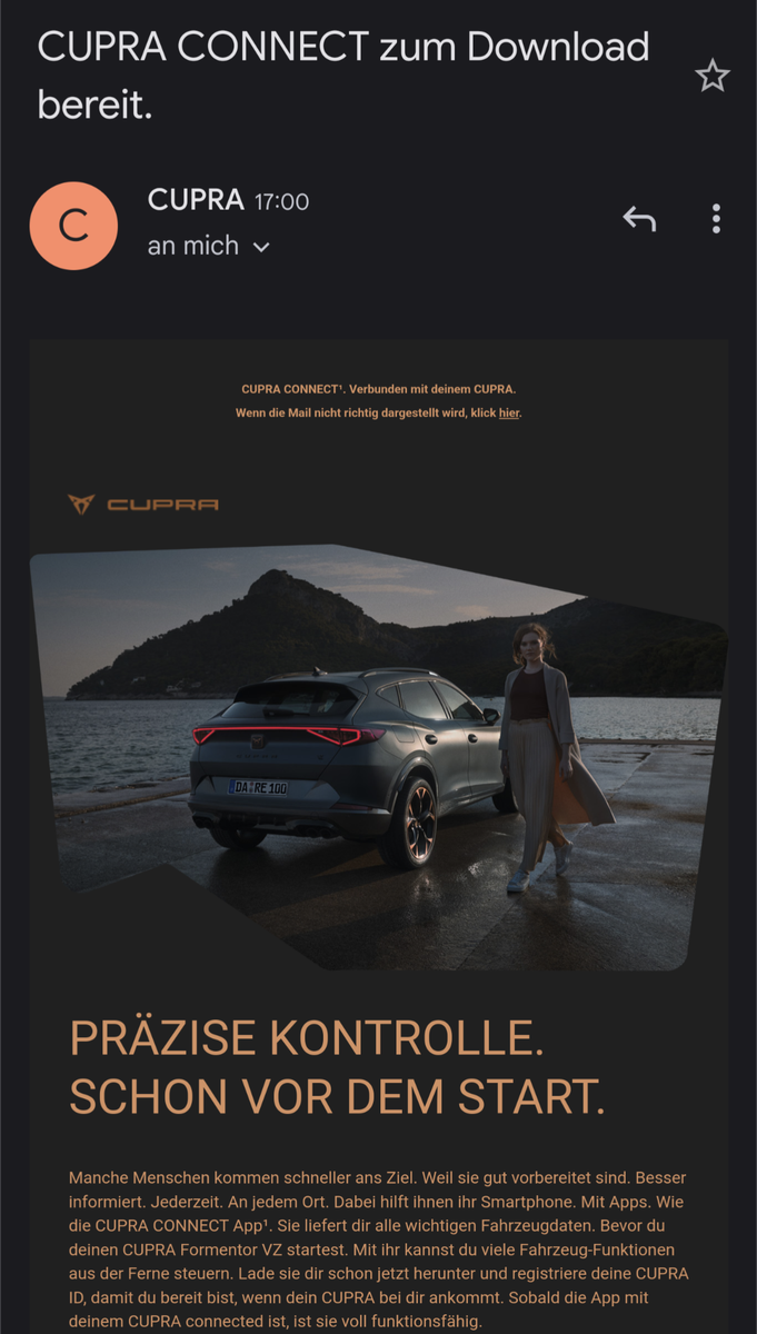 Aber: Ich habe bislang keine weitere Email von Cupra erhalten, obwohl ich mir sicher bin, nach der ersten Email allem zugestimmt zu haben.