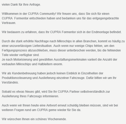 Neue Mails von Cupra bekommen? Oder irgendwas vom Händler gehört?