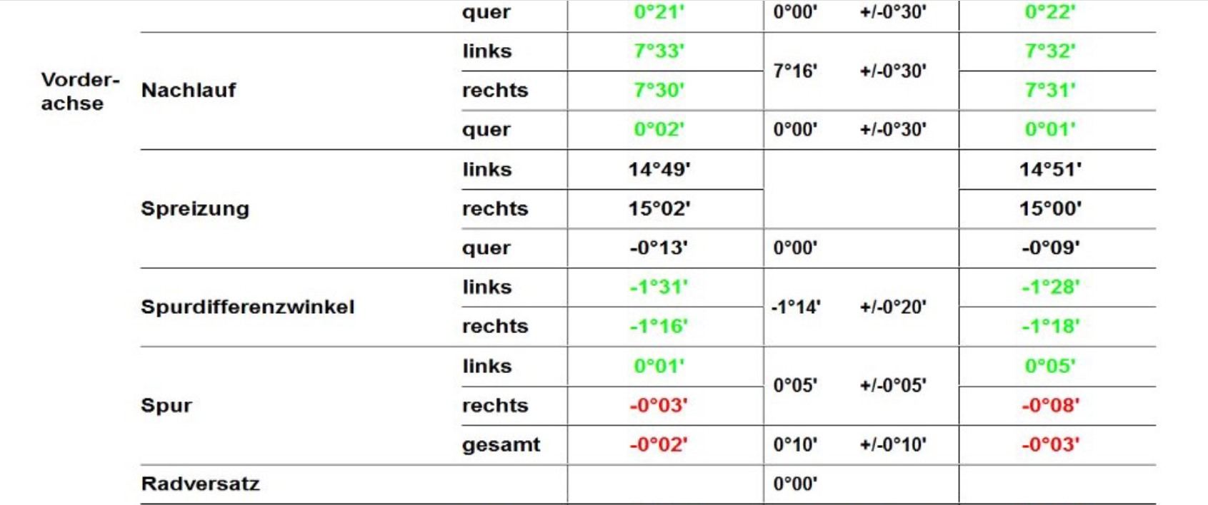 • Ist-Spur vorne: rechts ‬0° ‪7', links ‬0° ‪7'‬