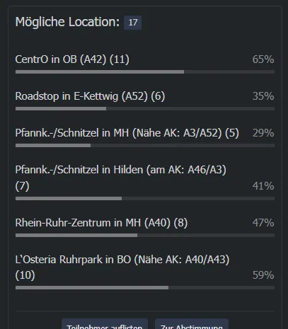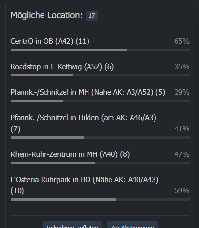 Die Terminfindung können wir erstmal hinten anstellen. Primär ist interessant, wer und wieviel (von wo kommend, die Profile sind nicht immer gefüllt) Interesse an einem solchen "familiären" Treffen hat, damit eine zentrale Location zur Auswahl gestellt werden kann. Womöglich besteht ja auch das Interesse, mit Partner zu kommen?