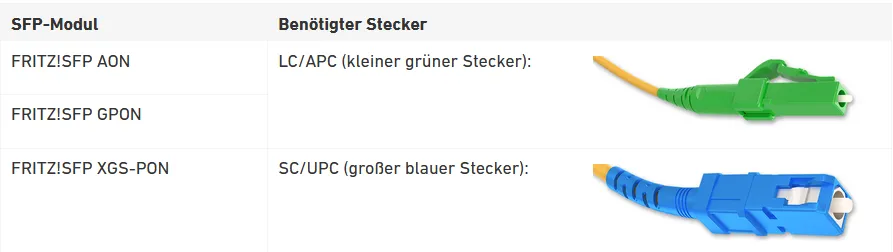 Die FRITZ!Box benötigt einen Typ LC/APC und der Stecker der ins Modem geht ist Typ SC/APC