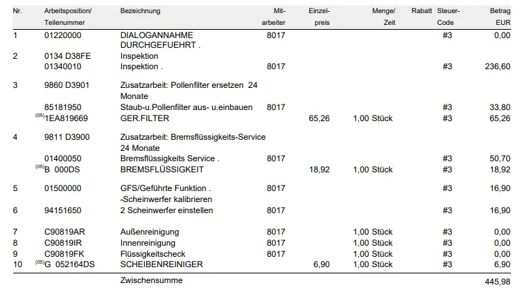 ich war heute beim Vertragshändler zur Inspektion nach zwei Jahren. Gemäß System wurde vorgeschlagen, dass die Bremsflüssigkeit als auch der Staub- bzw. Pollenfilter gewechselt werden muss. Als ich den wahrscheinlichen Preis von 534,- EUR gehört habe, wäre ich fast vom Stuhl gefallen. Am Ende sind es 522,51 EUR geworden. Es war ein Vertragshändler von Cupra daher dachte ich mir schon, dass es teurer wird. Aber den Preis finde ich tatsächlich sehr frech. Welche Erfahrungen habt ihr gemacht? Findet ihr den Preis gerechtfertigt? Der Preis im Screenshot ist exklusive der Mehrwertsteuer.