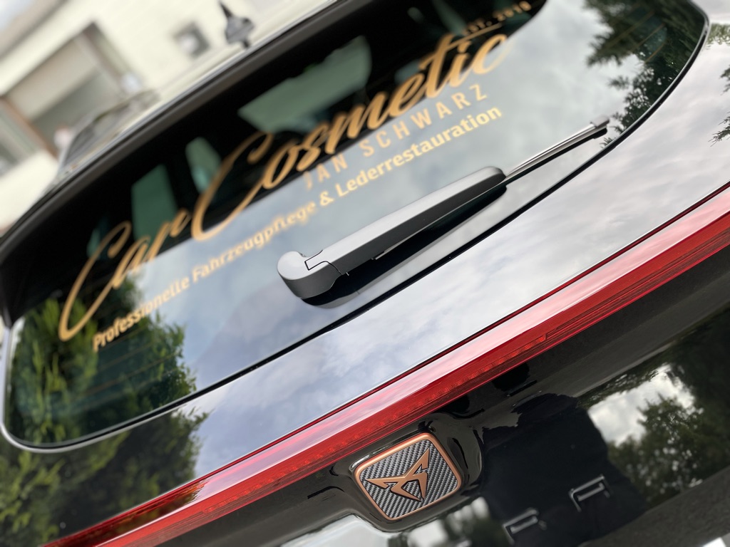 Nachdem der gesamte Lack in zwei Polierdurchgängen auf Hochglanz und zu 95% (100% sind nie möglich) defektfrei poliert wurde, bekam die komplette Lackoberfläche sowie die Auspuffblenden eine Keramikversiegelung. Auch alle Glasflächen wurden poliert und beschichtet.