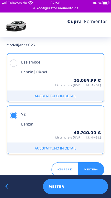 Da ich zum Formentor Fan geworden bin überlege ich mir meinen zweiten Formentor zu bestellen. Da mein Leasing in 12/23 abläuft muss ich wohl auch bald bestellen bei den Lieferzeiten… da der VZ-E-Hybrid optimal zu meinem Fahrprofil passt wäre er trotz Wegfall der Förderung meine 1.Wahl - aber gefühlt ist er zu teuer (Leasingangebot 48 Monate Privatleasing ,10tkm, Alles Serie (wg. der Vergleichbarkeit) bin ich bei 374€p.m. - ist das realistisch oder nur mein Händler vor Ort zu teuer? Meint ihr dass evtl. Nächstes Jahr Rabatte rausgehauen werden da die sonst -ohne Förderung- auf den Hybriden sitzen bleiben…. ?