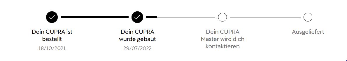 Stand 29.07.22: Dein Cupra wurde gebaut (laut Tracking, laut NADIN "Ankunft Hafen")