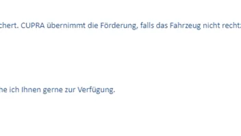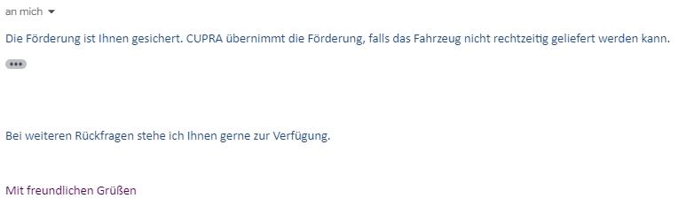 Verrückt, nachdem mein Händler mir jetzt die Produktion für KW44 angekündigt hat habe ich gefragt wie eng es denn dann mit der Förderung wird. Nach meiner Meinung wäre das dann schon echt knapp. Seine Antwort kam ziemlich flott und erstaunt mich jetzt doch ein wenig. Ich weiß nicht was ich davon halten soll und wie viel ich davon glauben kann nachdem er mit Mitte des Jahres sagte Cupra hat bereits angekündigt die Förderung nicht übernehmen zu wollen.