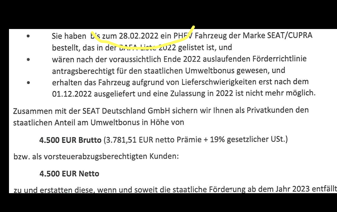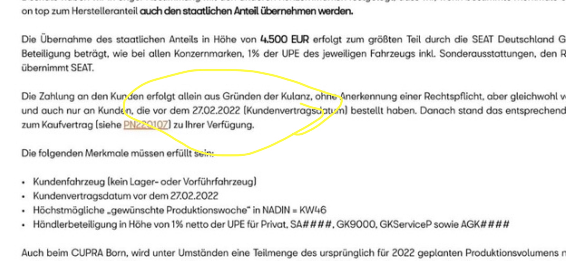 Hi, ne frage du hast ja von Seat ein schreiben wo es steht 28.02.22 , ich habe noch einen gesehen wo es steht 27.02.22 kannst du bitte ein link oder Kopie zuschicken. Da ich am 28.02.22 mein Kaufvertrag abgeschlossen habe . Danke