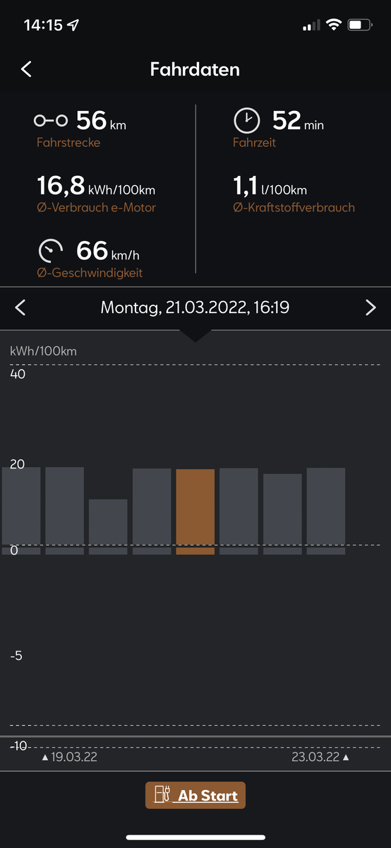 Nein, rein elektrisch schaffe ich die 57km noch nicht. Im langezogenem Bergaufstück schaltet sich der Motor zu. Habe morgens auf dem Hinweg sowohl auf dem Rückweg so ein Bergaufstück. Daher der Benzinverbrauch.