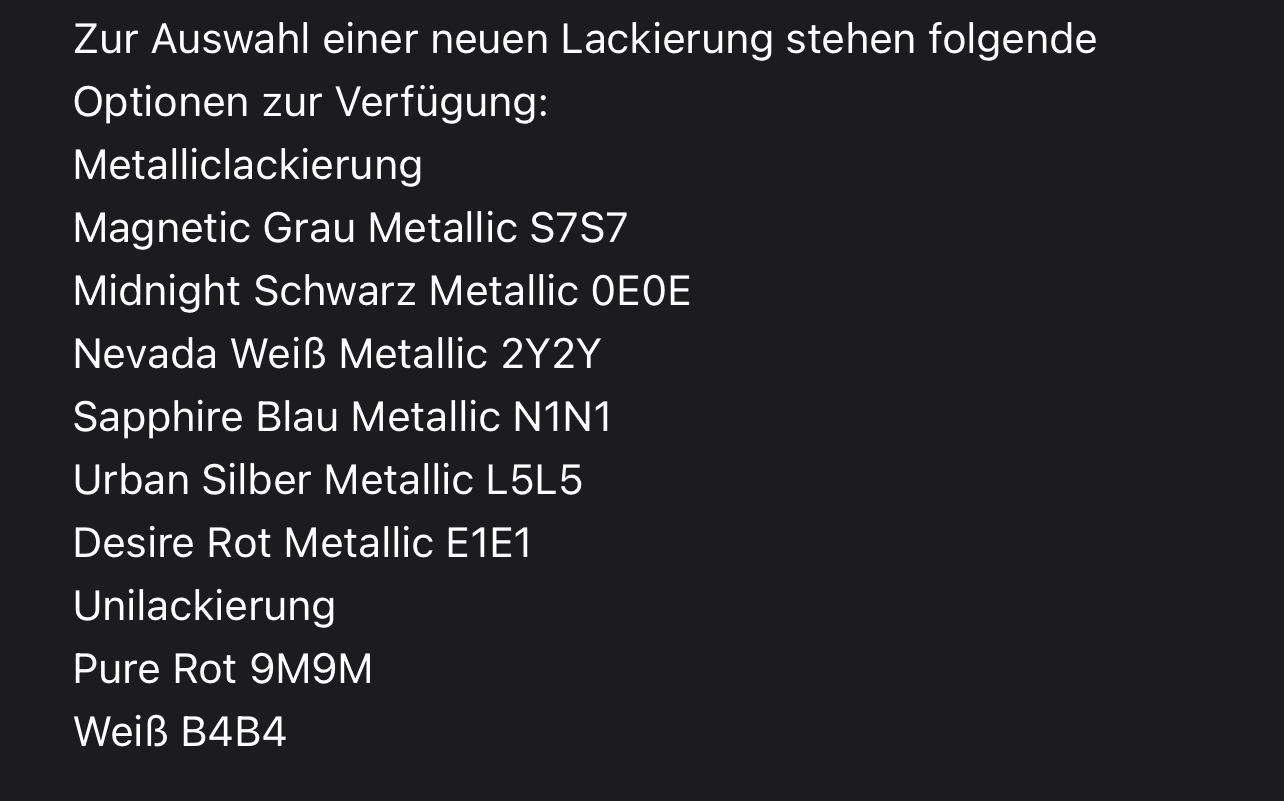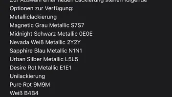 Ich habe heute vom Händler eher weniger erfreuliche Nachrichten erhalten. Statt Infos zum Liefertermin wurde mir eine Zusatzvereinbarung zugeschickt. Ich solle doch bitte einer neuen Farbe zustimmen, da Asphalt Blau nicht mehr lieferbar ist. Ein Entgegenkommen war auch keineswegs angedacht.