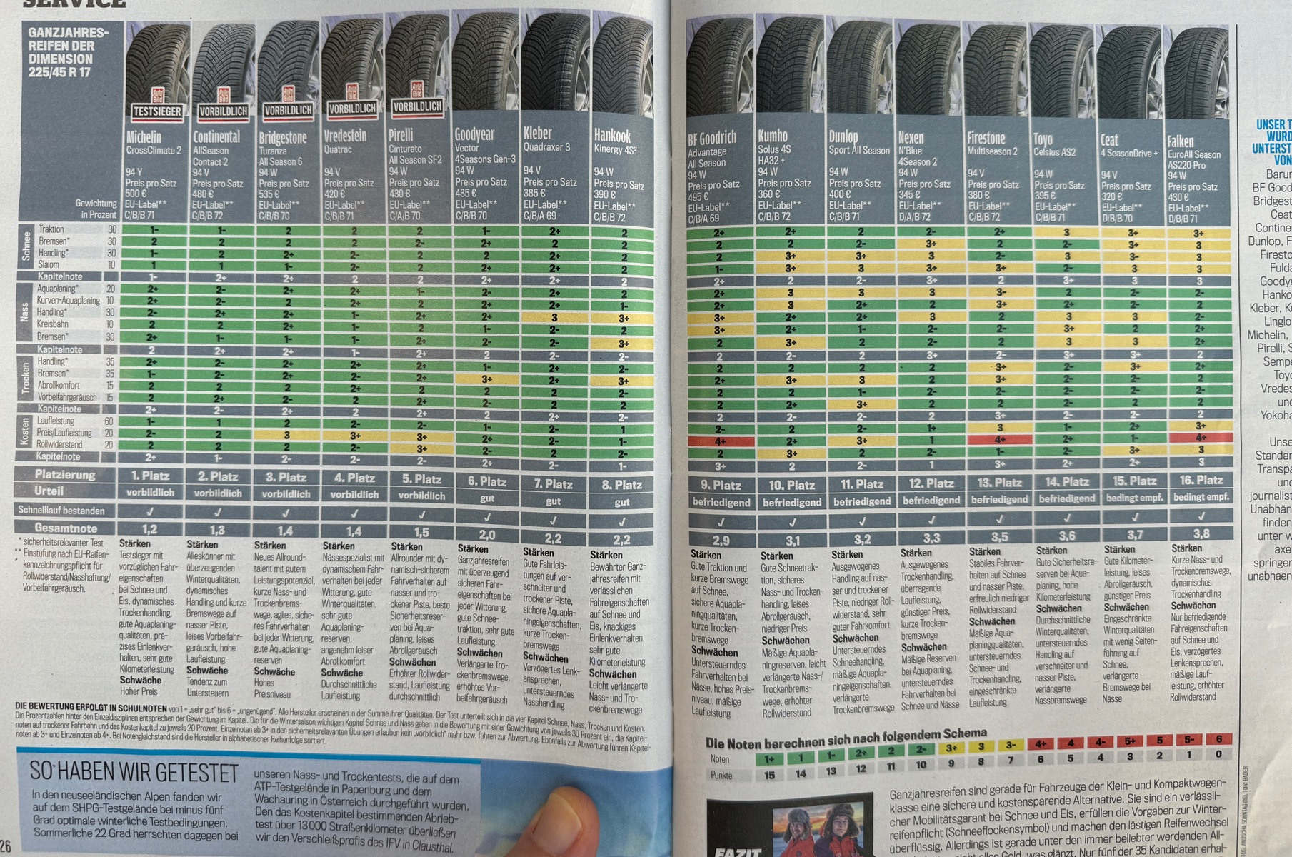 Mir persönlich wären Tests lieber, die Reifen mit einer Laufleistung von ca. 5tkm checken. Meine ersten GJR (damals von Fulda) waren zwar für mich fahrtechnisch gut, aber ca. 4tkm wurden sie bereits recht laut. Die jetzigen von Vredestein (auf unserem Audi) sind dagegen auch nach deutlich längerer Laufleistung top.